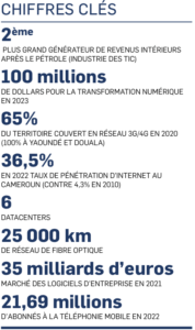 Le gouvernement ambitionne le développement d’une industrie numérique locale et le développement d’applications « made in Cameroon ». L’écosystème start up est très dynamique et bénéficie du soutien étatique. En ce sens, a été créé le Cameron Digital Innovation Center (CDIC), un incubateur national afin de soutenir le développement de l’écosystème entreprenariat numérique local et accélérer la transformation digitale. L’association KmerTech, réseau camerounais des structures d’accompagnement à l’entrepreneuriat innovant, structure et fédère plus de 40 incubateurs et accélérateurs privés avec le soutien de l’Union Européenne. Les opérateurs de télécommunication sont des acteurs incontournables de cette impulsion, ils couvrent 65% du territoire en réseau 3G/4G en 2020 (100% à Yaoundé et Douala) et deviennent des acteurs de la transformation digitale avec l’intégration de services à valeur ajoutée (solution professionnelle, Cloud, SAAS). En termes d’infrastructure, le pays compte 6 Datacenters (Orange, MTN, Camtel, Campost, ST Digital, CDIC) et 25 000 km de réseau de fibre optique. Le marché de la transformation digitale était estimé à environ 2,9 Mds € et représentait 6% du PIB en 2019. Avec la digitalisation des entreprises, plus de 40% du budget des administrations et des entreprises de services est consacré aux solutions informatiques.
