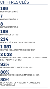 Plus spécifiquement, les autorités envisagent d’améliorer l’efficacité du système de santé en mettant à profit la décentralisation ; de mettre sur pied la Couverture Santé Universelle ; de promouvoir le développement d’une industrie pharmaceutique locale ; de favoriser la performance hospitalière et la démarche qualité dans les FOSA ; de renforcer l’accessibilité géographique aux soins de santé ; de disposer de personnels de santé qualifiés et motivés ; et d’améliorer la gouvernance sanitaire.